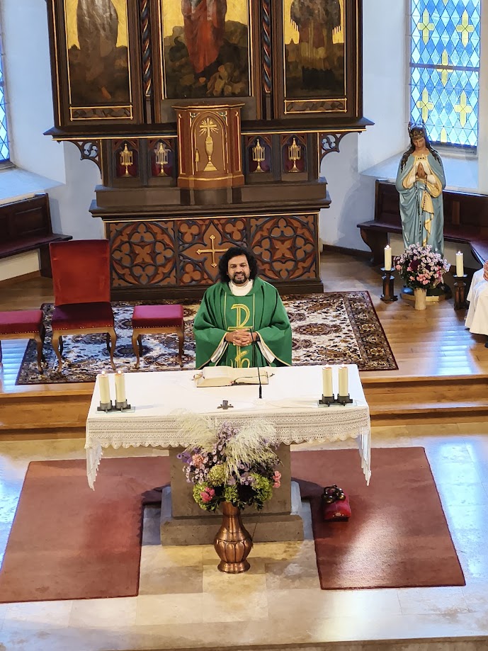 Am Sonntag den 21. September 2025 feierten wir zum ersten Mal mit unserem neuen Kaplan Angelo Rajaseelan die Sonntagsmesse. Zahlreiche Pfarrangehörige nahmen an der hl. Messe teil. Am Ende der hl. Messe wurde er vom stellvertretenden Vorsitzenden des PGR Hans Grill im Namen der Pfarre und von Frau Bürgermeisterin Michaela Walla von Seiten der Gemeinde herzlich begrüßt. Wir wünschen ihm alles Gute und viel Freude an seinem Wirken in unserer Pfarre!