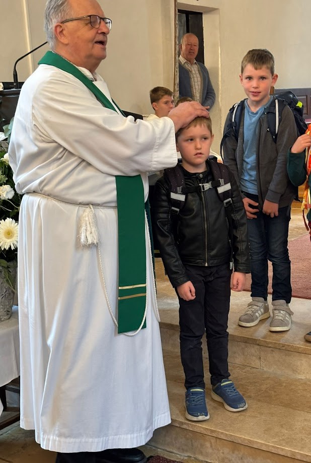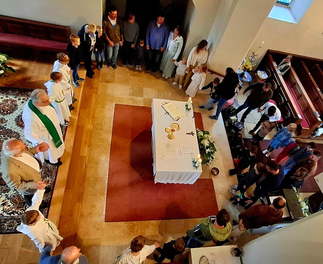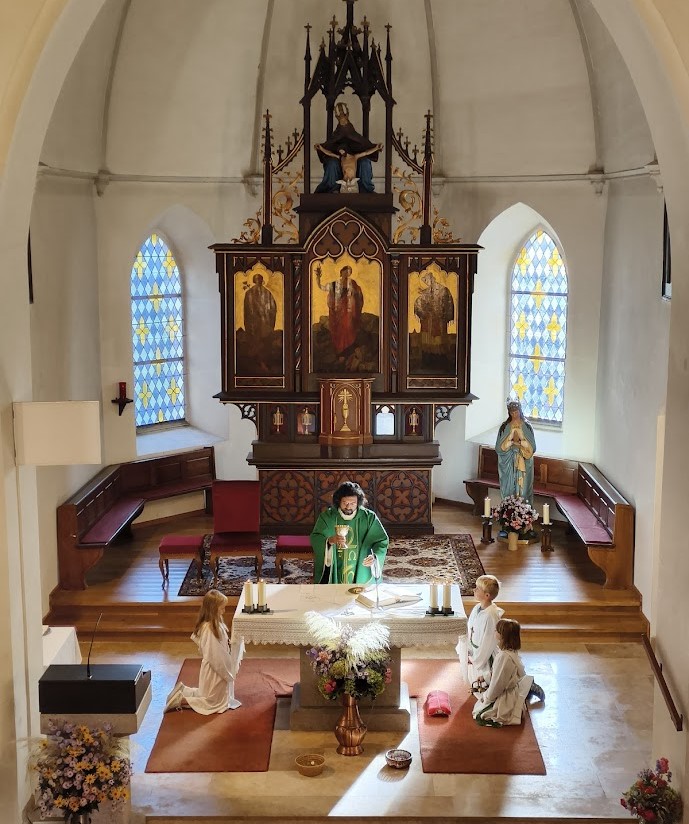 Am 27. April feierte unsere Pfarre mit Rosalie, Paul, Lotta und Louisa das Fest der heiligen Kommunion. Mit Hingabe und Freude begleiteten Herr Pfarrer Stani und Frau Johanna Jeitler die Kinder ein halbes Jahr und bereiteten sie auf die 1. heilige Kommunion vor. Es wurde zu einem sehr schönen Ereignis für unsere Erstkommunionkinder und die Pfarrgemeinde. Musikalisch umrahmt wurde das Fest wie jedes Jahr mit zarten Klängen von unserer Rhythmi. Die Kirche war gefüllt mit vielen lieben Menschen, die mit uns das Fest gefeiert haben. Im Anschluss waren alle eingeladen in die Alte Schule zu Kaffee und Kuchen oder zur Agape. Es war ein sehr schönes Fest mit viel Sonnenschein.