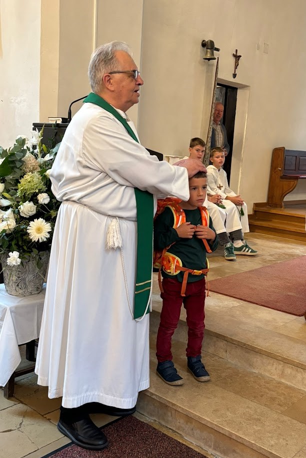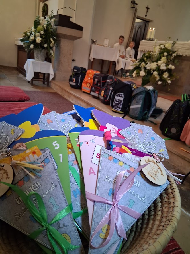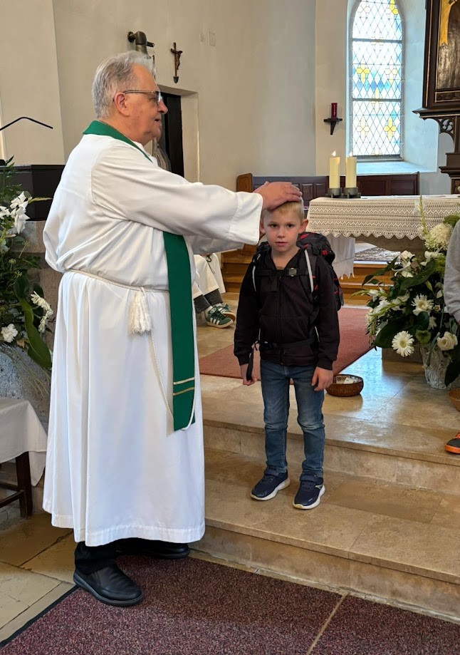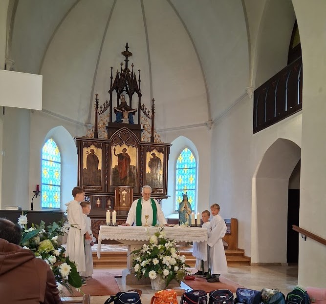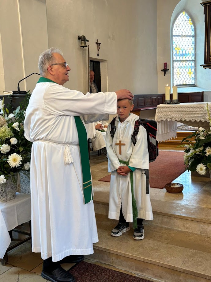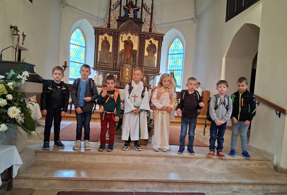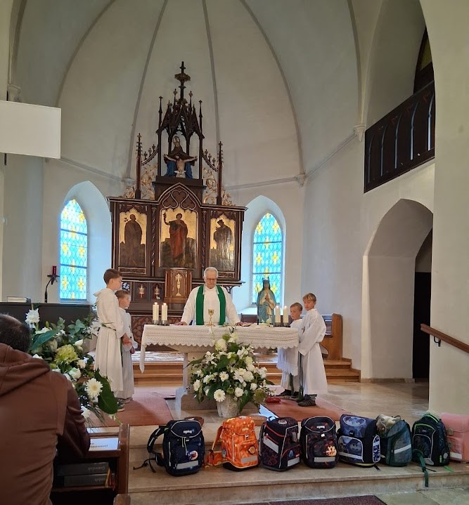 Unsere Schulanfänger Michael Gullner, Frederik Spitzer, Harald Puchegger, Niklas Peinsipp, Tymon Schwarz, Samuel Spies, Philipp Kürner und Emma Christian erhielten am Sonntag, den 31. 8. 2025 von unserem Herrn Pfarrer Stani den Segen für einen guten Schulstart. Wir wünschen Euch viel Freude, Erfolg und viele Freunde in der Schule!