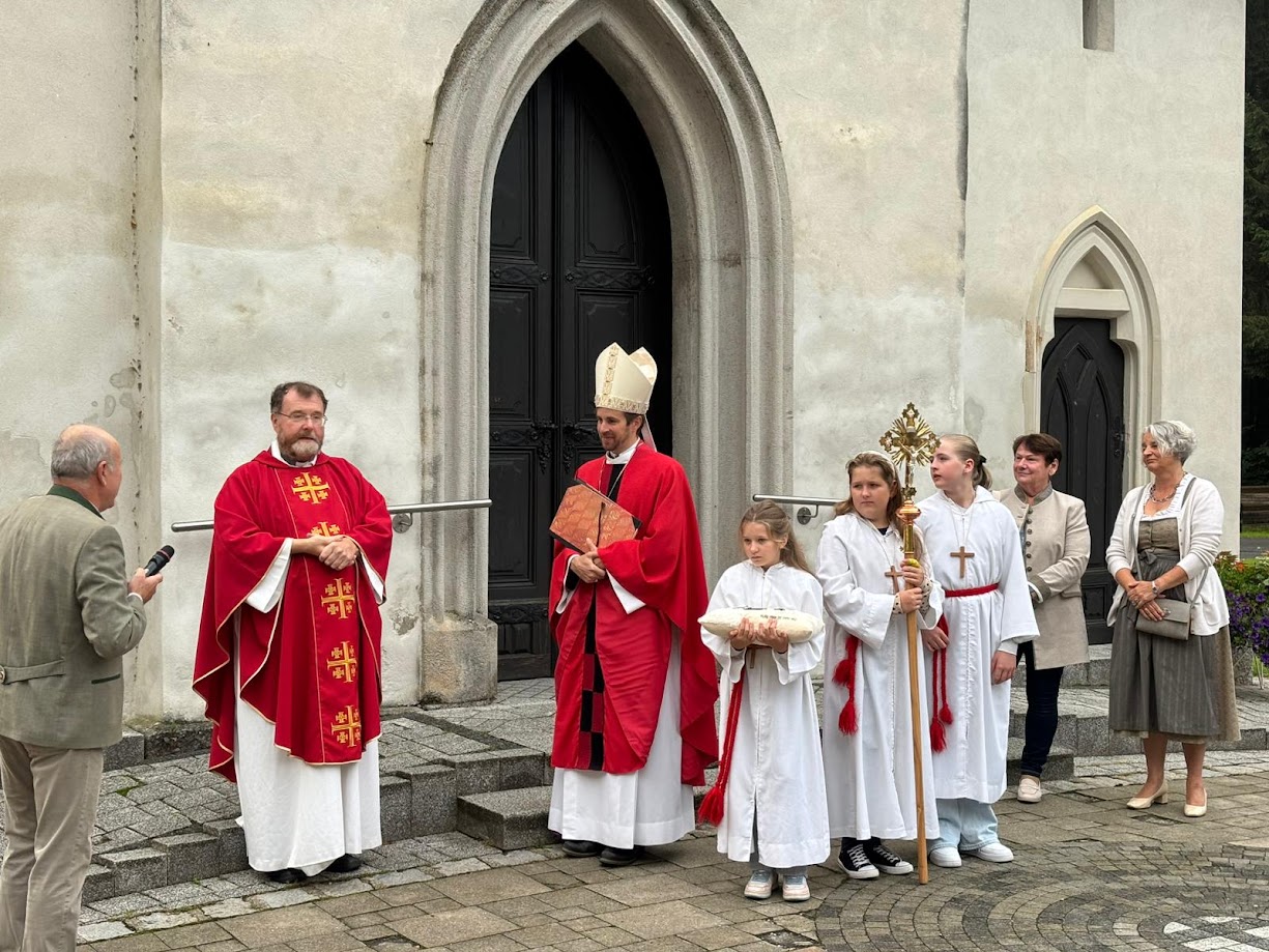 Vorerst wurde die Kirche zugesperrt, die Gläubigen mussten vor der Kirche warten. Prälat Bernhart, Ulrich Dambeck und StV. Vorsitzender Hans Grill zogen mit den Ministranten um die Kirche und stellten sich vor der Kirche auf. Frau Bgm. Michi Walla und StV. Hans Grill begrüßten den Prälat Bernhart und Pfarrer Ulrich. Zeremoniell wurde dem Pfarrer Ulrich Dambeck der Schlüssel übergeben und er sperrte die Kirche auf, damit alle Anwesenden in die Kirche einziehen konnten.